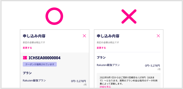 ・お手続き完了前に、「受け取りとお支払い方法」ページのお申し込み内容にて、クーポンコードが表示されることを必ずご確認ください- 「Rakuten最強プラン(データタイプ)」は対象外です