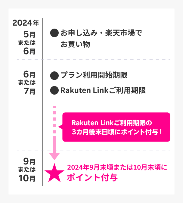 - ※付与されるポイントのうち、キャンペーンコード:2091による6,000ポイントは、「Rakuten最強プラン」のプラン利用開始および「Rakuten Link」アプリの利用が確認された月の翌々末日ごろから3カ月間にわたり付与