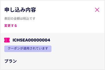 「お申し込み内容」画面であらかじめクーポンコードが表示されていることをご確認のうえ、お申し込みを完了してください。