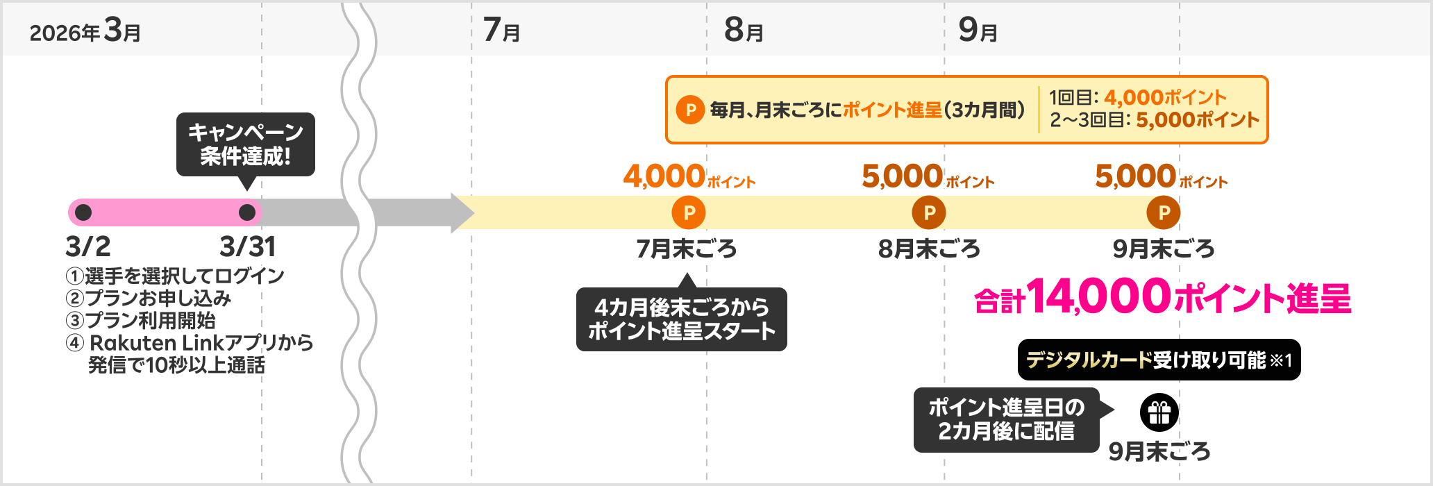 3月に条件を達成した場合、以下の予定でポイントの進呈とデジタルカードの配信を行います。