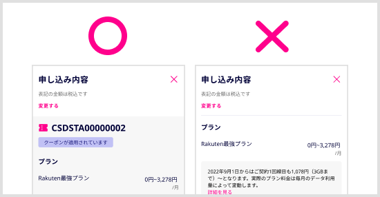 ・お手続き完了前に、「受け取りとお支払い方法」ページのお申し込み内容にて、クーポンコードが表示されることを必ずご確認ください【3】【1】の翌月末日までに「Rakuten最強プラン」利用開始
