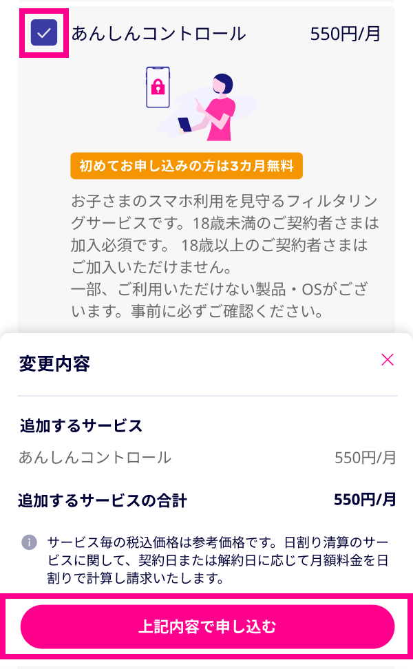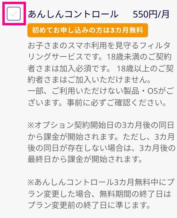 ※18歳未満の方があんしんコントロールを選択されなかった場合、回線契約申し込みの途中で自動的に追加されます。