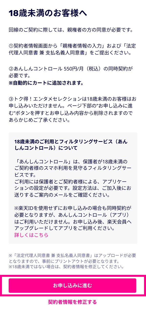 18歳未満の方が楽天モバイルをお申し込みの場合、あんしんコントロール のお申し込みが必須となります。