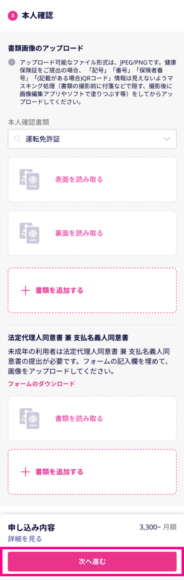 本人確認書類と法定代理人同意書のアップロードをしてください。