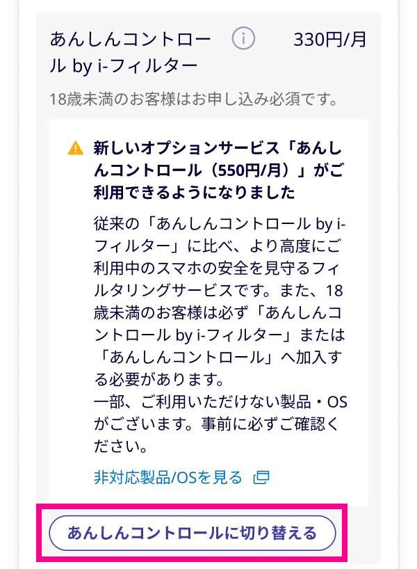 • 「あんしんコントロール」は、18歳未満の方は申込原則必須、18歳以上の方は申込不可になります。