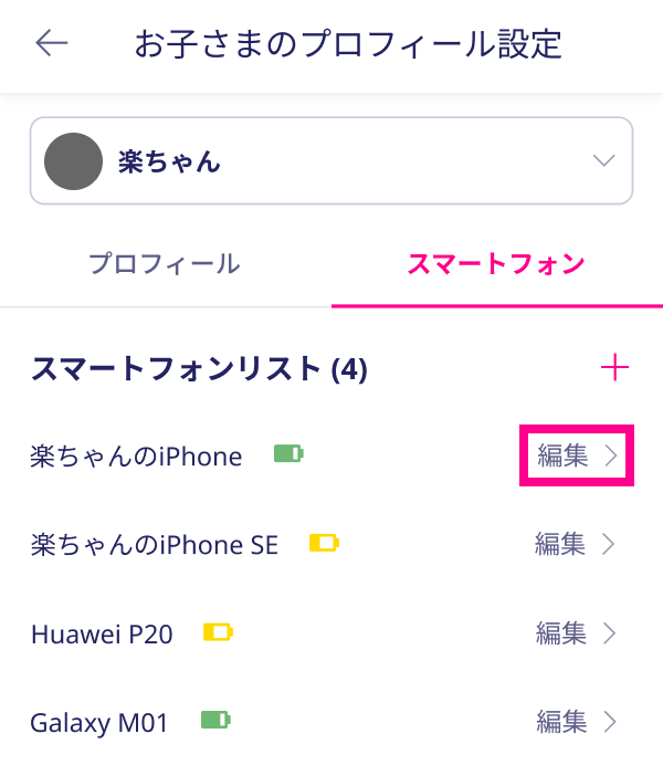 お子さまのスマートフォンリストを開き、「編集」をタップしてください。