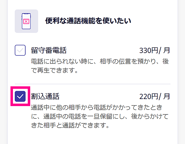 プラン選択後、詳細画面にある「オプションサービス」の項目から「割込通話」を選択し、お申し込みください。