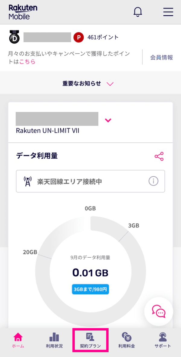 my楽天モバイルの下部アイコン「契約プラン」を選択し、画面が変わりましたら「各種手続き」内の「SIM再発行を申請する」をタップします。