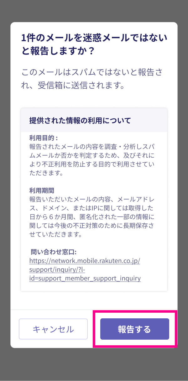 迷惑メールとして報告のみしたい場合は、チェックをせず「報告する」ボタンをタップしてください。