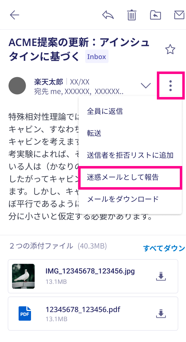 右上の「︙」メニューから「迷惑メールとして報告」をタップしてください。