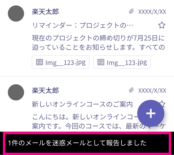 「送信者を拒否リストに追加」にチェックを入れずに報告した場合のメッセージは以下の通り表示されます。