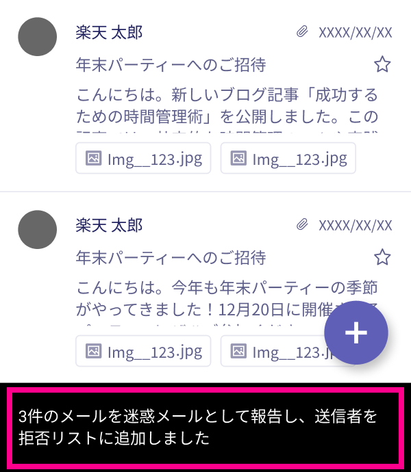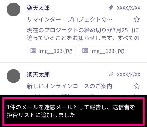 「送信者を拒否リストに追加」にチェックを入れて報告した場合のメッセージは以下の通り表示されます。