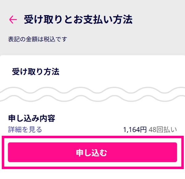 契約者情報や受け取り方法、お支払い方法を登録後、「申し込む」を選択してください。