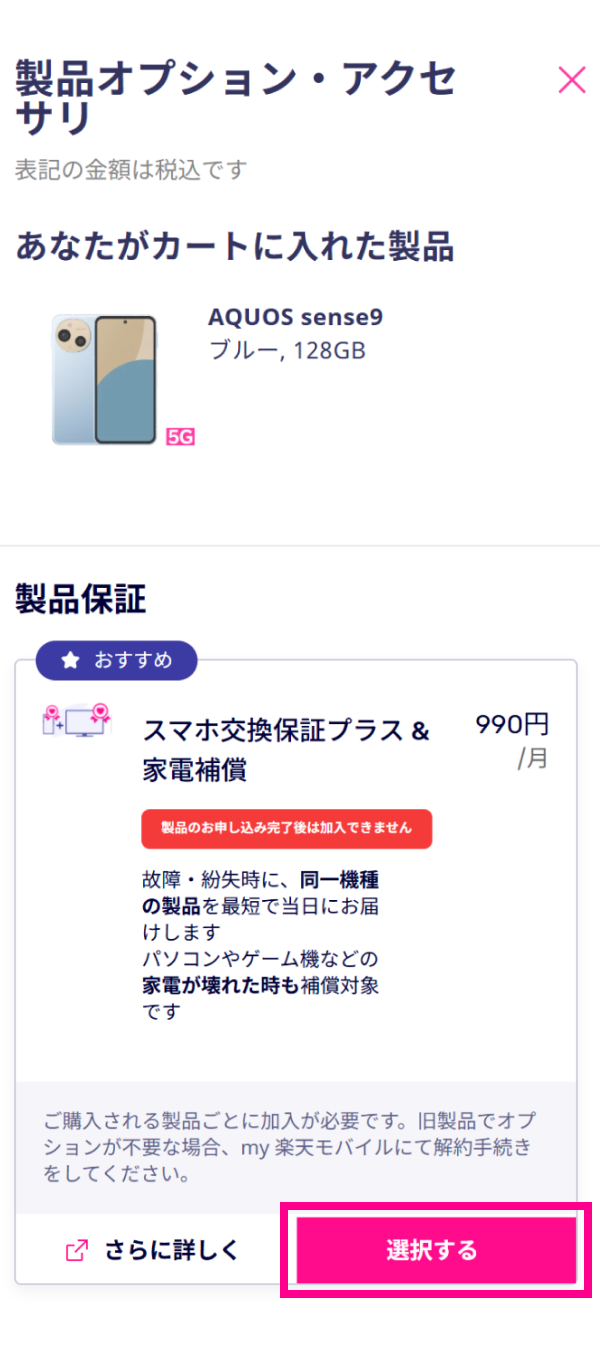 5. 製品オプション・アクセサリから「スマホ交換保証プラス & 家電補償」の「選択する」をタップする
