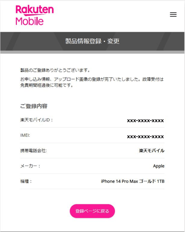 製品登録の完了画面が表示されたら、製品変更は完了となります。