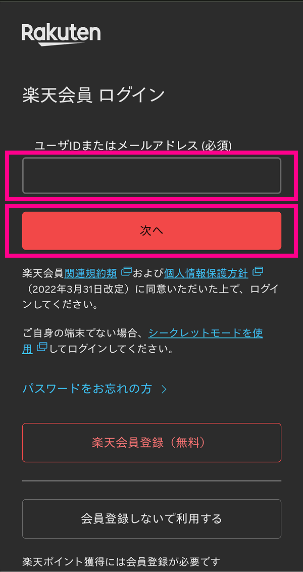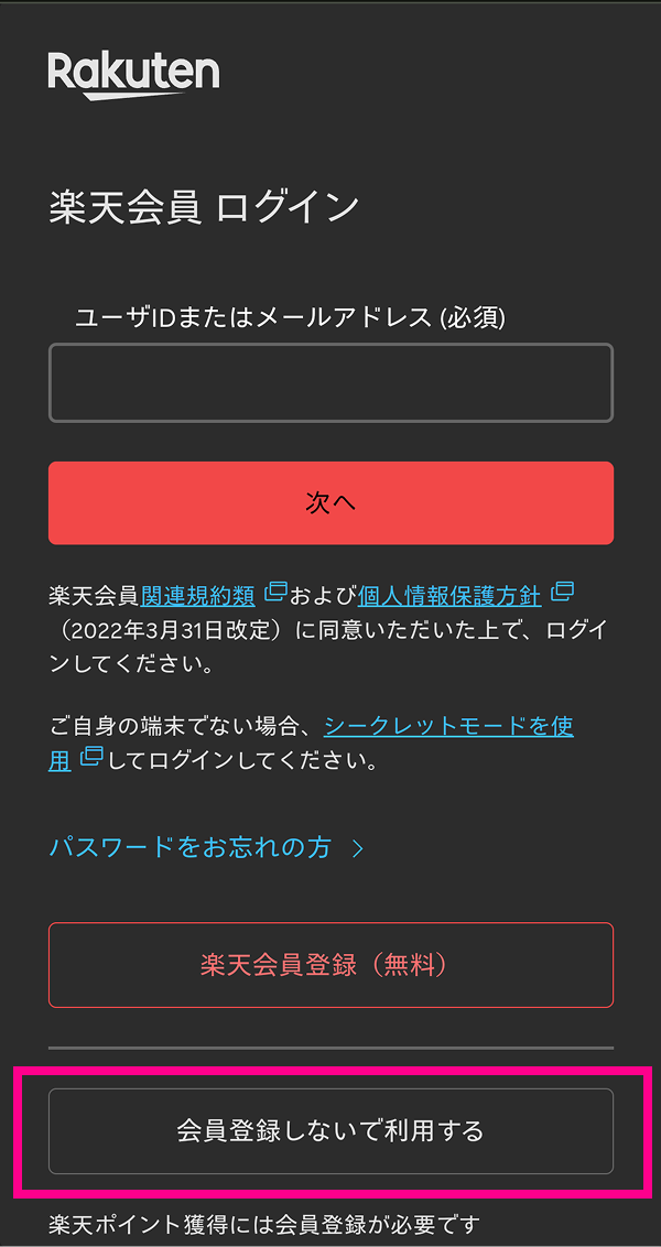 • ・「楽天IDを使用せずお申し込みされた方」は「楽天IDなし」の手順をご確認ください。