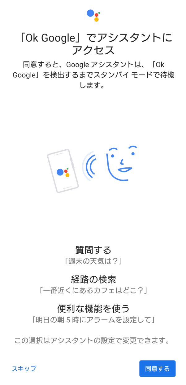 ※Googleアシスタントを設定しない場合は、「スキップ」をタップしてください。