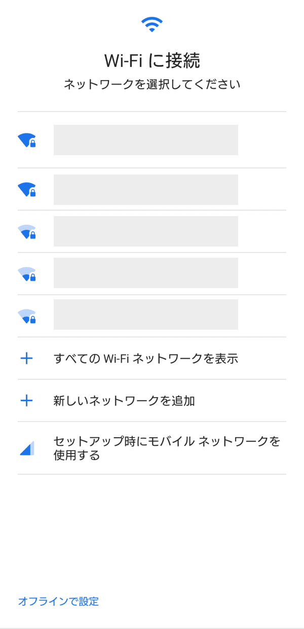 ※Wi-Fiの接続をしない場合は「オフラインで設定」をタップしてください。Wi-Fiの接続は後からでも設定することができます。