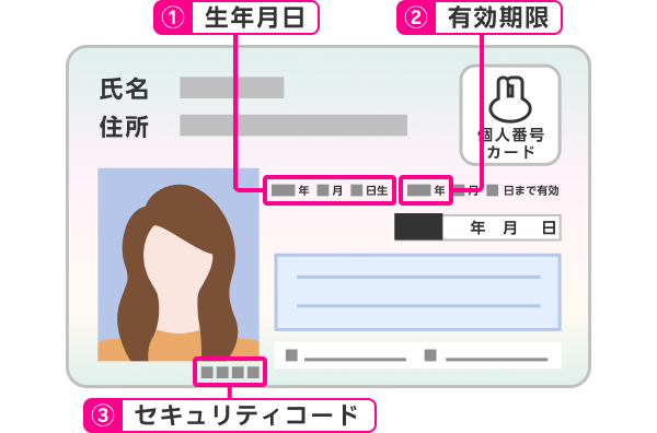 カード表面に記載されている、生年月日・有効期限・セキュリティコードです。