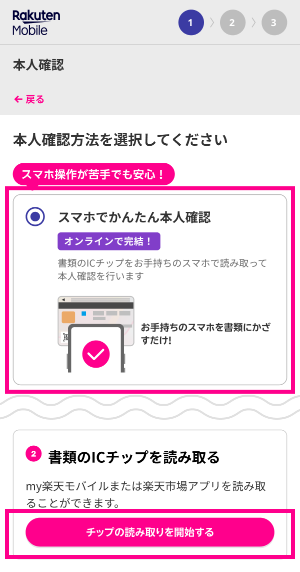 本人確認の画面で「スマホでかんたん本人確認」を選択し、画面下部にある「ICチップの読み取りを開始する」をタップしてください。