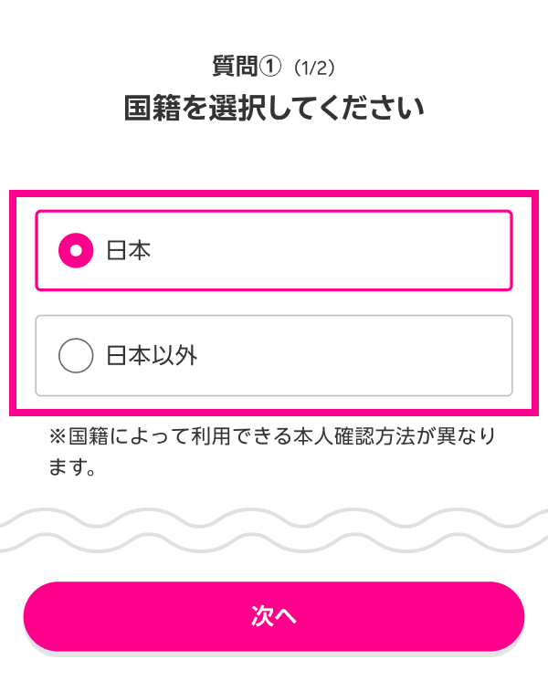 「本人確認をはじめる」をタップすると、国籍選択画面に遷移します。