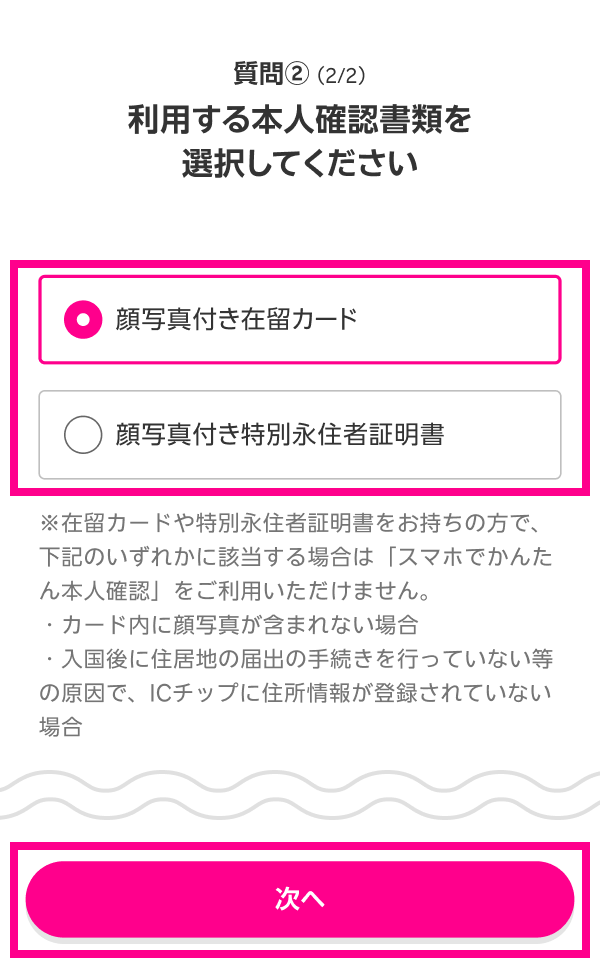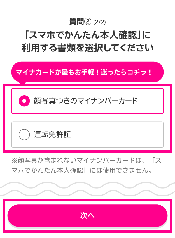 選んだ本人確認書類によって以降の手順が異なります。以下よりお使いになる本人確認書類の手順をご確認ください。