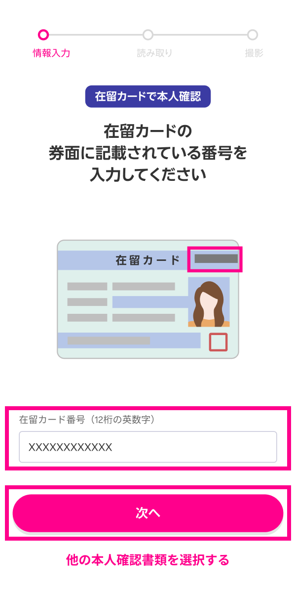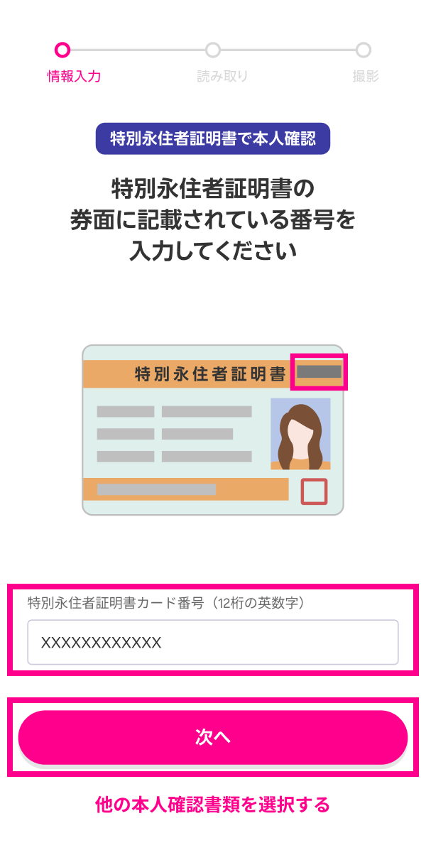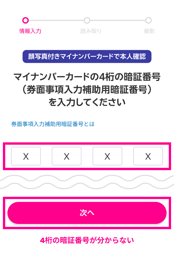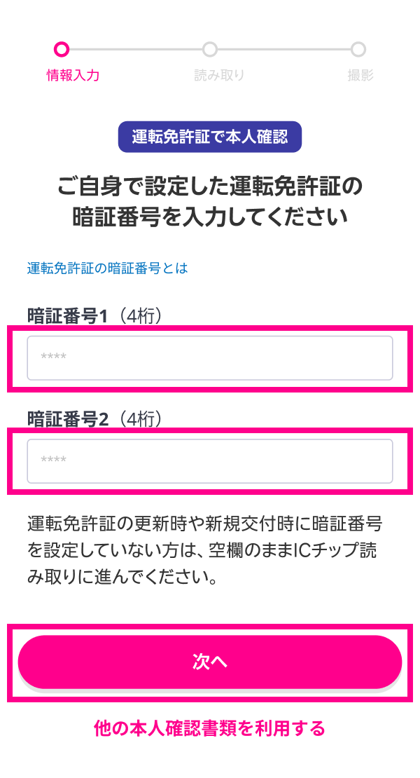 本人確認書類のICチップを読み取る際は、ご利用の本人確認書類の種類に応じて、暗証番号の入力や券面情報の入力が必要となります。