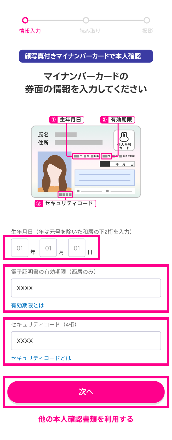 ※マイナンバーカードの券面情報は、画像内のピンク色の枠で囲まれている部分です。