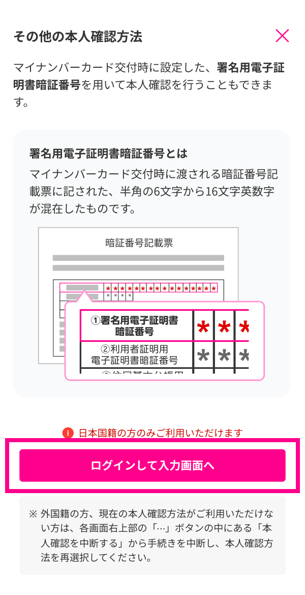 ※「他の本人確認方法を利用する」を選択した場合、署名用電子証明書暗証番号(6~16桁)を用いて行う本人確認方法を選択できます。(マイナンバーカードをお持ちの日本国籍のユーザーのみ利用可能です。)
