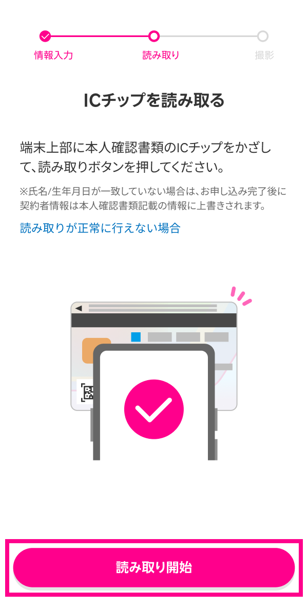「読み取り開始」をタップし、選択した本人確認書類(マイナンバーカード、運転免許証、在留カード、特別永住者証明書)のICチップの読み取りを開始してください。