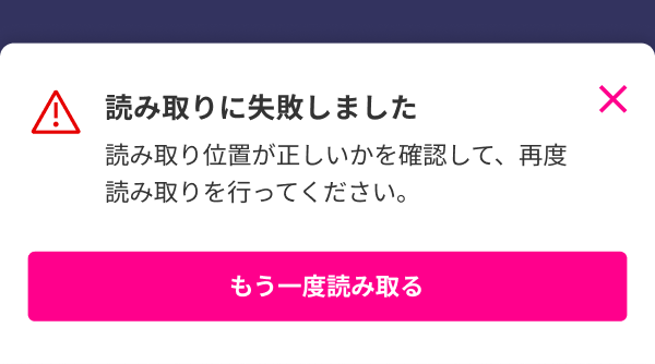 ICチップの読み取りに失敗した場合、以下のようなエラー画面が表示されます。画面の指示に従ってご対応ください。