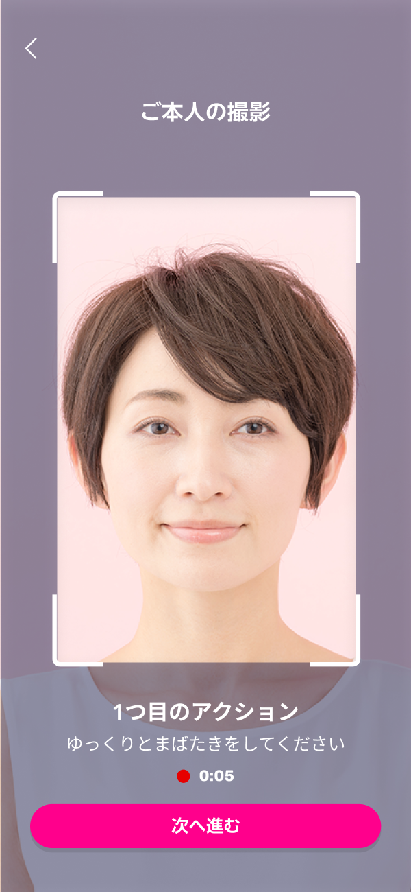 画面の指示に従い必要な情報を入力し、本人確認書類(顔写真付き)のICチップを読み取ったうえで、画面上に案内されるアクションを撮影することで本人確認が完了します。