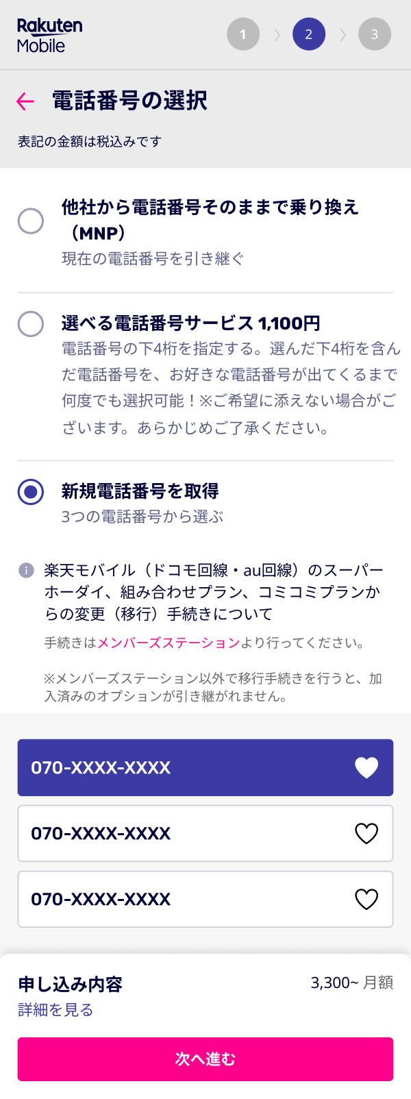 Webのお申し込み画面、または「my 楽天モバイル(アプリ/Web)」から、プランを選択後、製品やオプションサービスを選び、契約者情報の入力画面へお進みください。