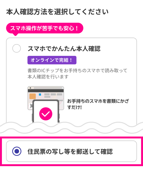 本人確認のステップにて「住民票の写し等を郵送して確認」をご選択の上、お申し込みを完了してください。