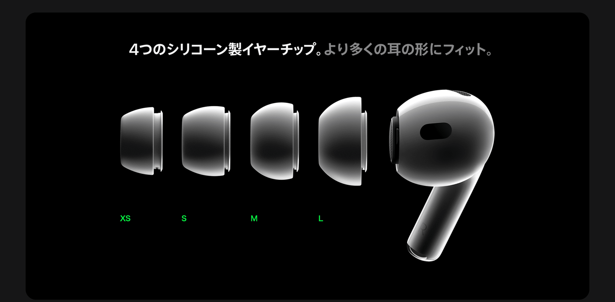 - 装着感をカスタマイズ — より多くの耳の形にフィットし、一日中快適につけていられるように、4つのシリコーン製イヤーチップ(XS、S、M、L)が付属しています。イヤーチップは耳の中を密閉して音を遮断し、AirPods Pro 2を適切な位置に固定します。