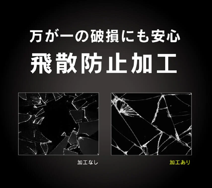 ※本製品はJIS K5600引っかき硬度(鉛筆法)基準による10Hの硬度試験をクリアしております - ガラスを貼り付ける時の接着シリコン層により、万が一ガラスが割れてしまった時にも粉々に飛び散ることを防ぎます。