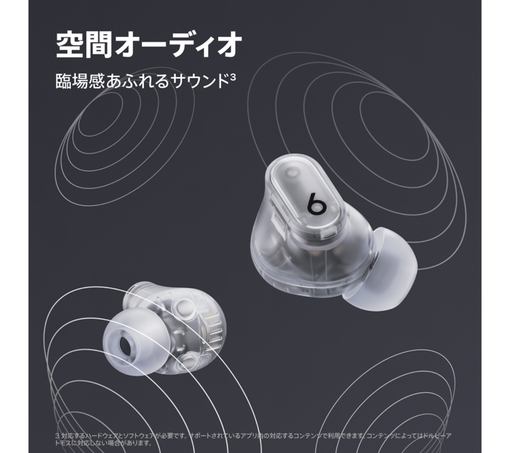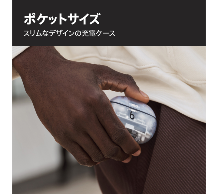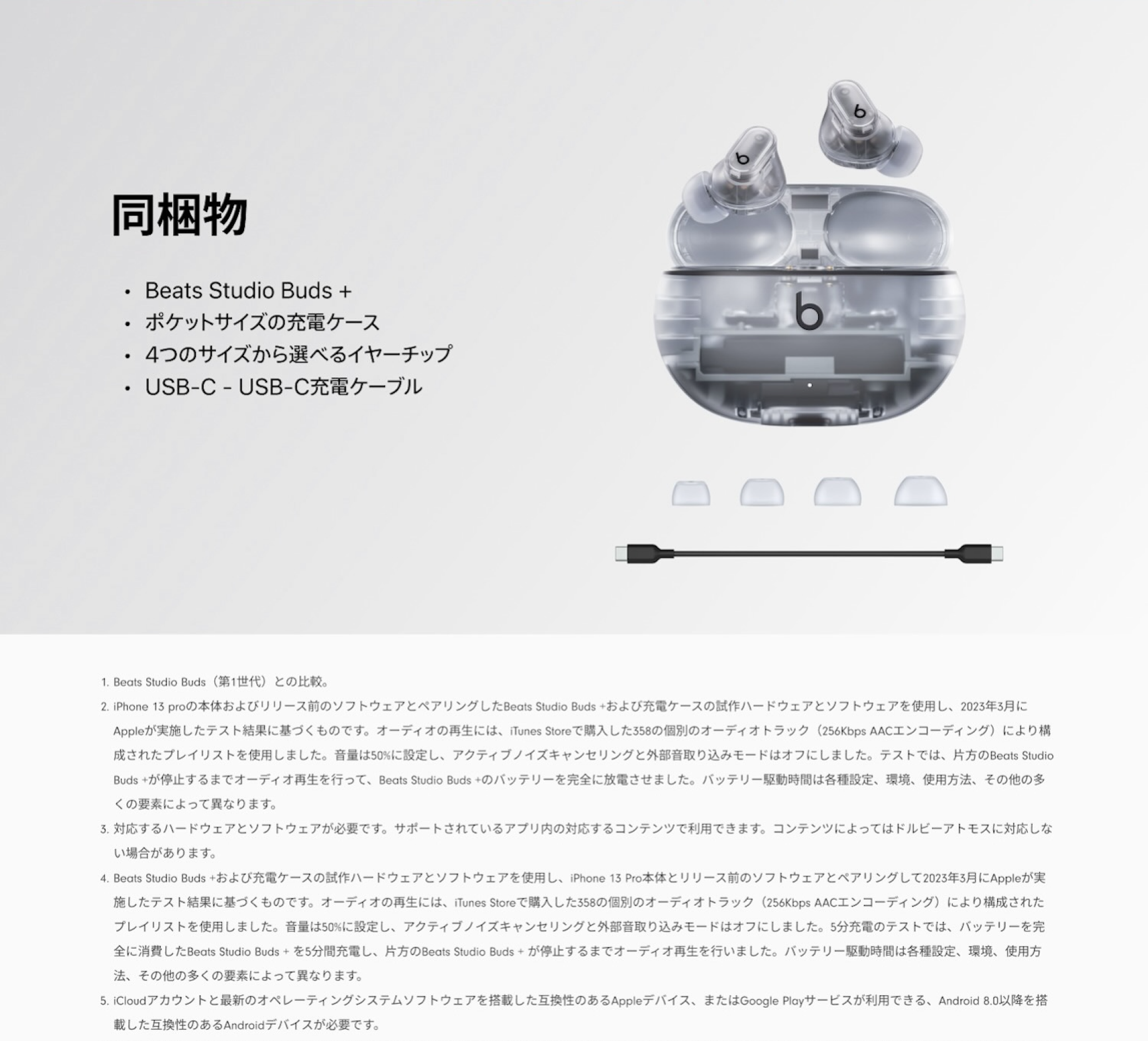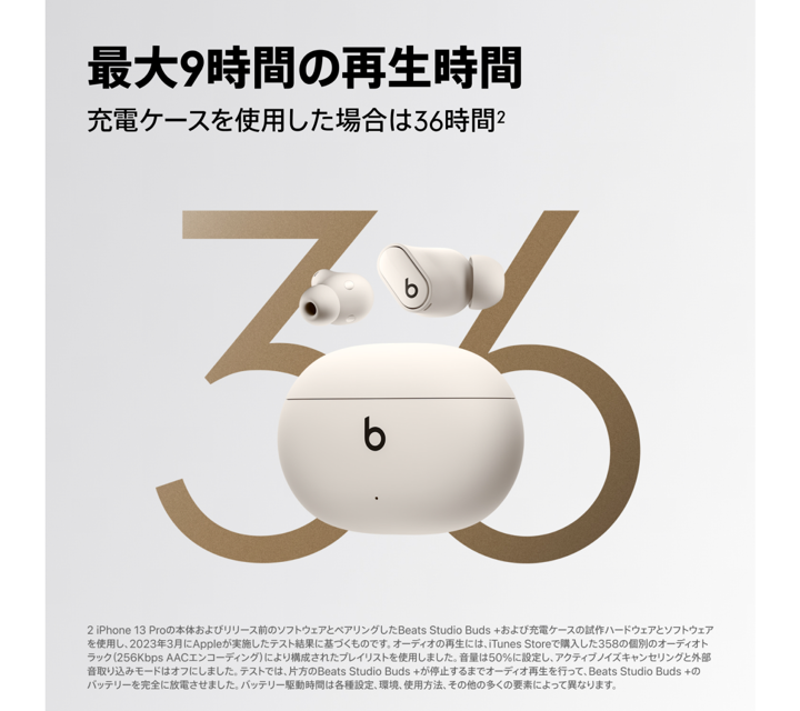 - ※2 iPhone 13 Proの本体およびリリース前のソフトウェアとペアリングしたBeats Studio Buds +および充電ケースの試作ハードウェアとソフトウェアを使用し、2023年3月にAppleが実施したテスト結果に基づくものです。オーディオの再生には、iTunes Storeで購入した358の個別のオーディオトラック(256Kbps AACエンコーディング)により構成されたプレイリストを使用しました。音量は50%に設定し、アクティブノイズキャンセリングと外部音取り込みモードはオフにしました。5分充電のテストでは、バッテリーを完全に消費したBeats Studio Buds +を5分間充電し、片方のBeats Studio Buds +が停止するまでオーディオ再生を行いました。バッテリー駆動時間は各種設定、環境、使用方法、その他の多くの要素によって異なります。