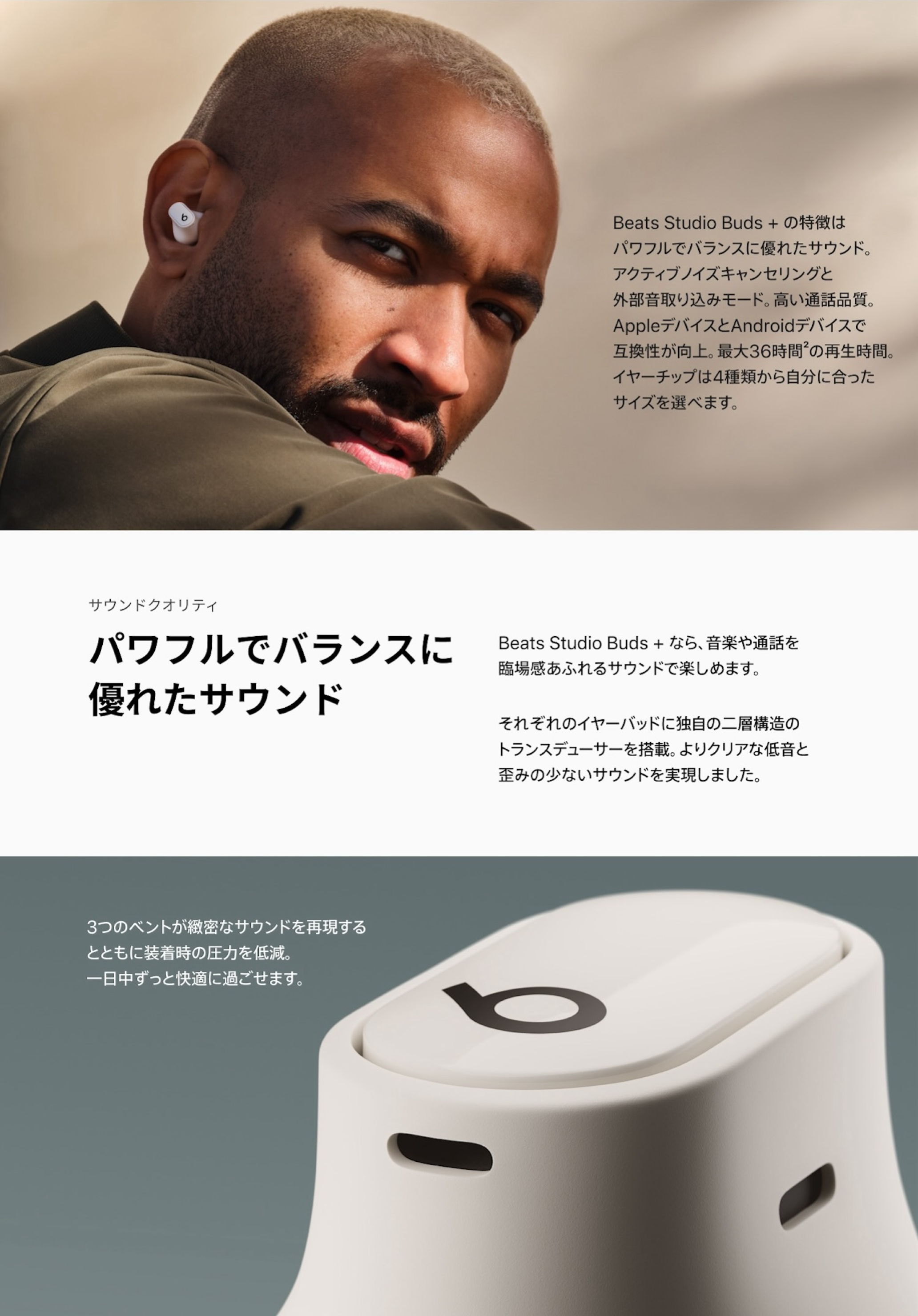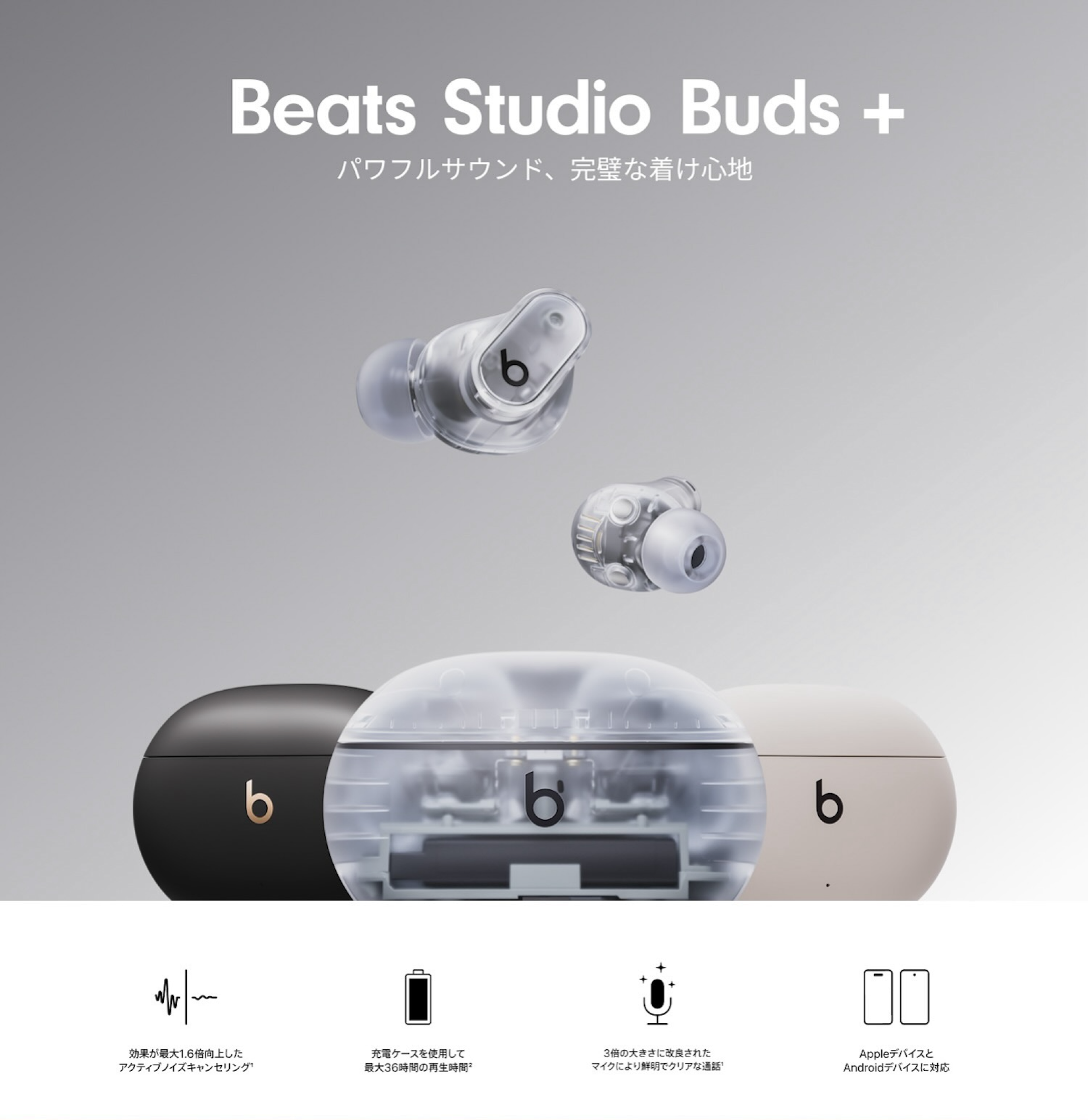 - Beats Studio Buds + はコンパクトで洗練されたデザイン、リッチなプレミアムサウンド。携帯性に優れています。Beats独自のアコースティックプラットフォームによる、パワフルでバランスに優れたサウンド。アクティブノイズキャンセリングと外部音取り込みモード。クリアな通話品質。最大36時間※1の再生時間。AppleデバイスとAndroidデバイスで互換性が向上。イヤーチップは4種類から自分に合ったサイズを選べます。