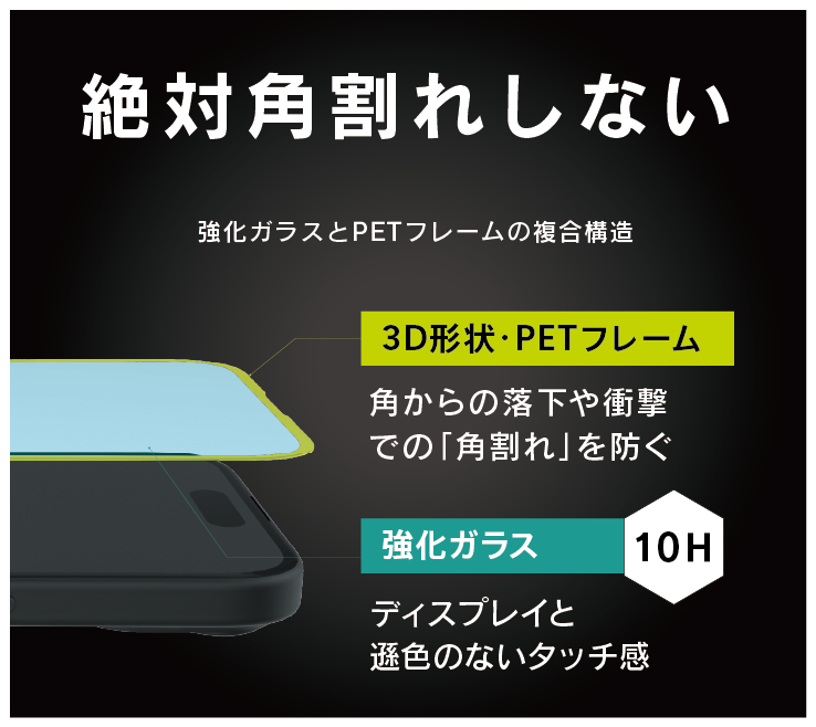 - PETフレーム+ガラスの複合素材で、ディスプレイをフルカバーする究極の立体成型最強プロテクターです。