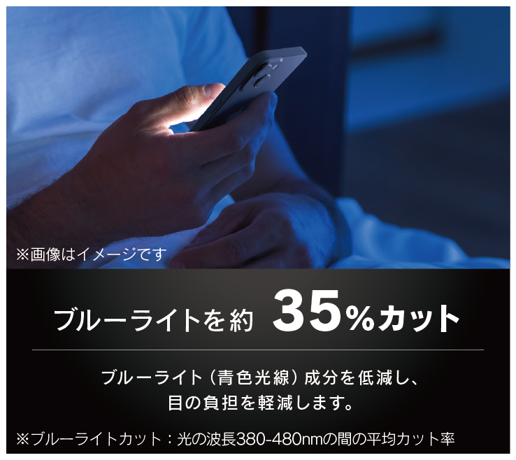 ブルーライト(青色光線)成分を約35%低減し、目の負担を軽減します。一般的なブルーライトカット製品のように黄色くならない、透明な仕上がりです。