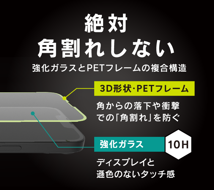 PETフレーム+ガラスの複合素材で、ディスプレイをフルカバーする究極の立体成型最強プロテクターです。
