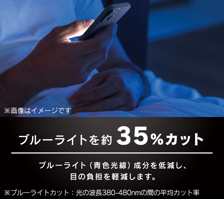 ブルーライト(青色光線)成分を約35%低減し、目の負担を軽減します。一般的なブルーライトカット製品のように黄色くならない、透明な仕上がりです。