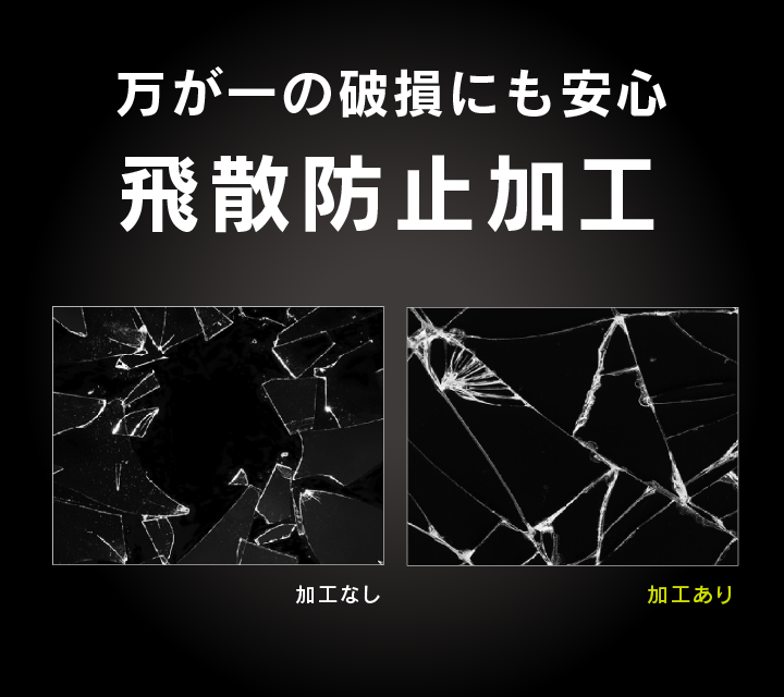 • ガラスを貼り付ける時の接着シリコン層により、万が一ガラスが割れてしまった時にも粉々に飛び散ることを防ぎます。