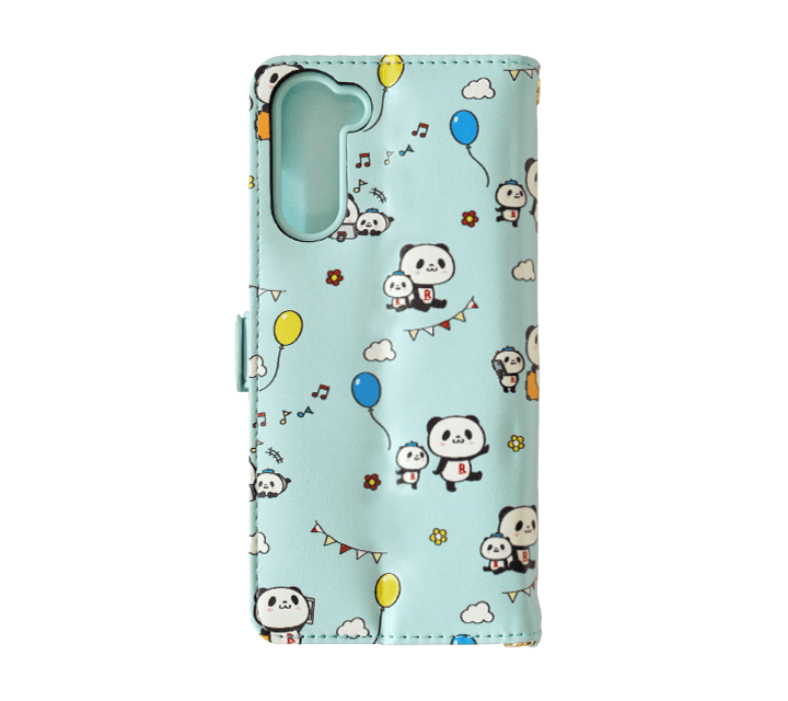 お買いものパンダとバルーンで楽しげな雰囲気の手帳型ケースです。