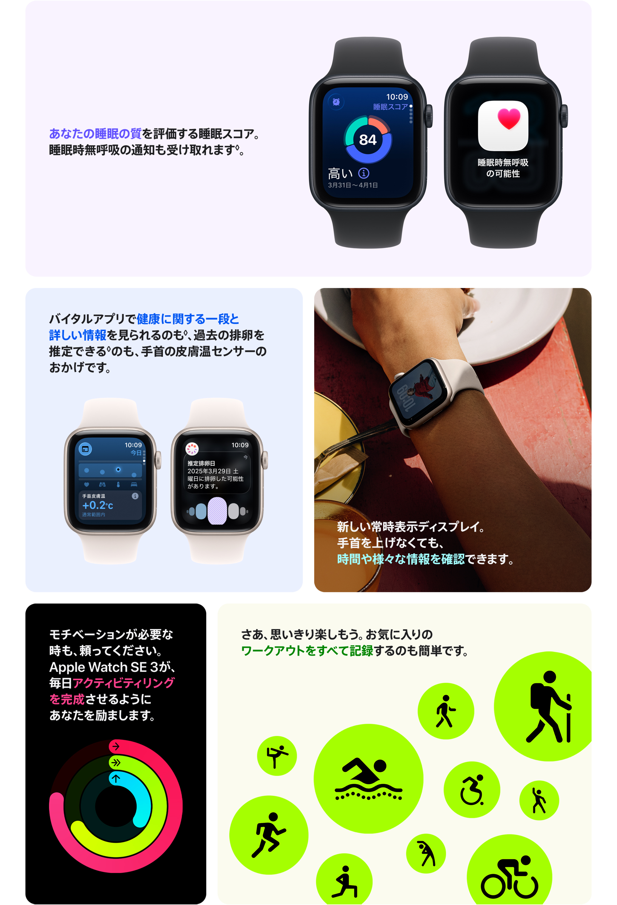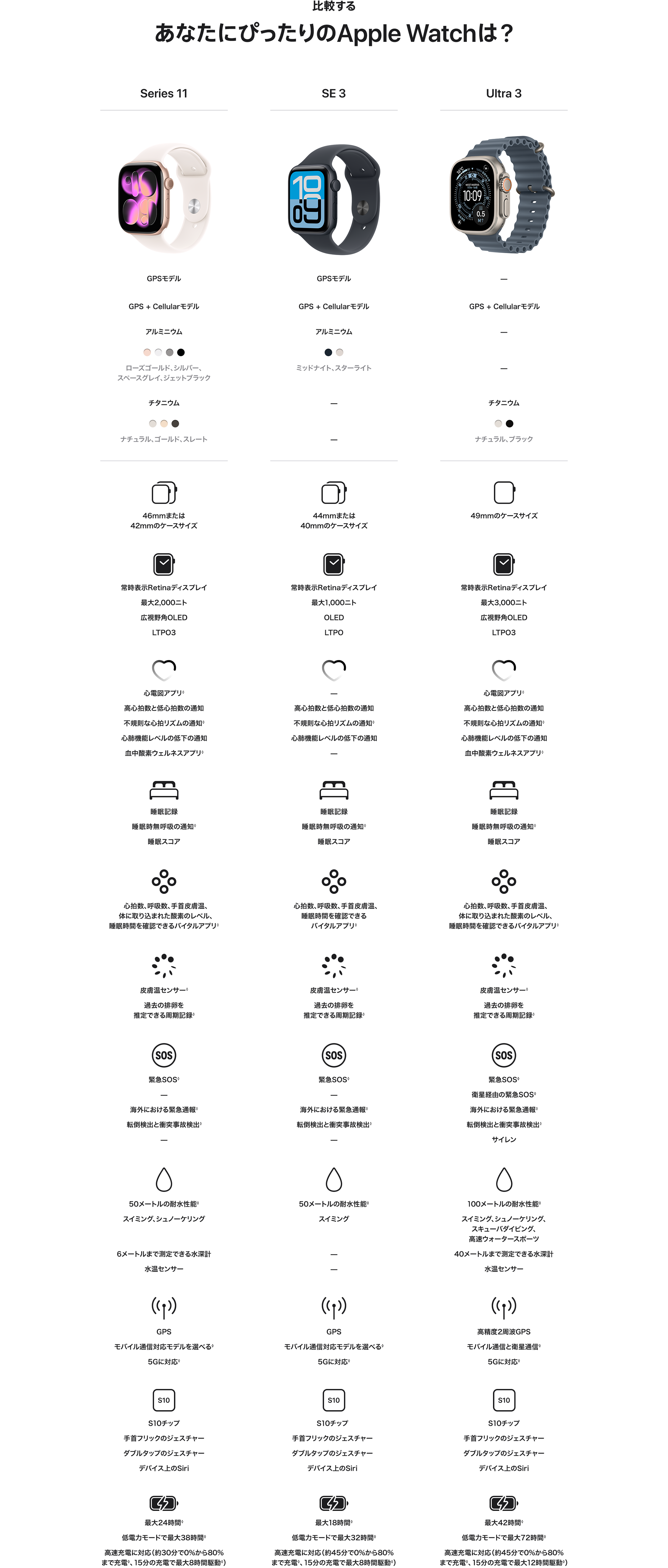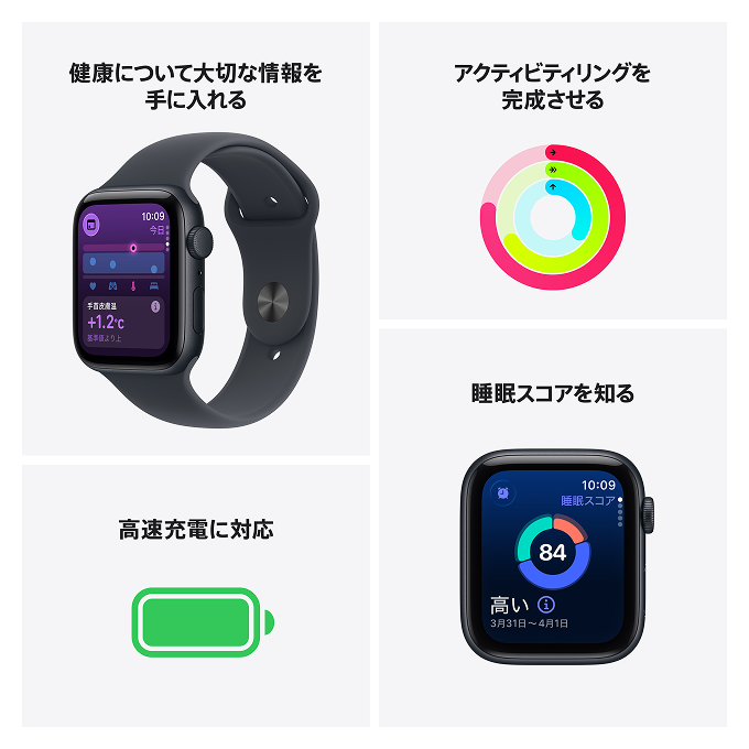 ※1 2025年9月12日時点。 NTTドコモ、au、ソフトバンクの公式オンラインのApple Watch本体代金との比較。弊社調べ。※2 楽天カードのみ。※3 この価格は最低価格の場合で、ケースやバンドによって価格が異なります。※4 2025年10月31日時点。Apple Watch SE(第2世代)2023年発売 - 44mm(GPS+Cellular)アルミニウムケースを下取りに出した場合。良品下取時。楽天キャッシュで付与。詳細はこちら