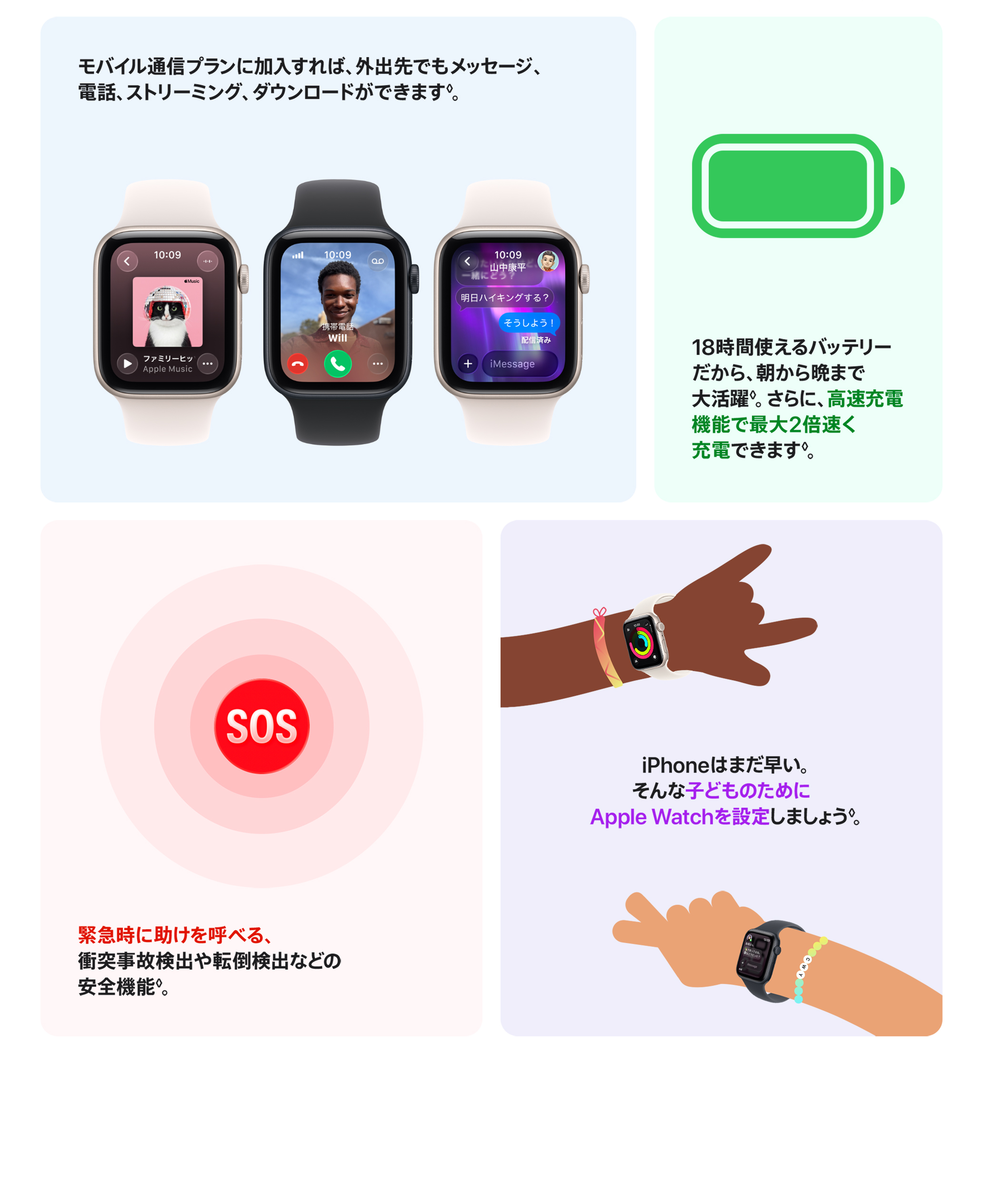 iPhoneを持っていないお子さまやシニアのご家族も、Apple Watchだけで音声通話・データ通信を利用できるサービスです。