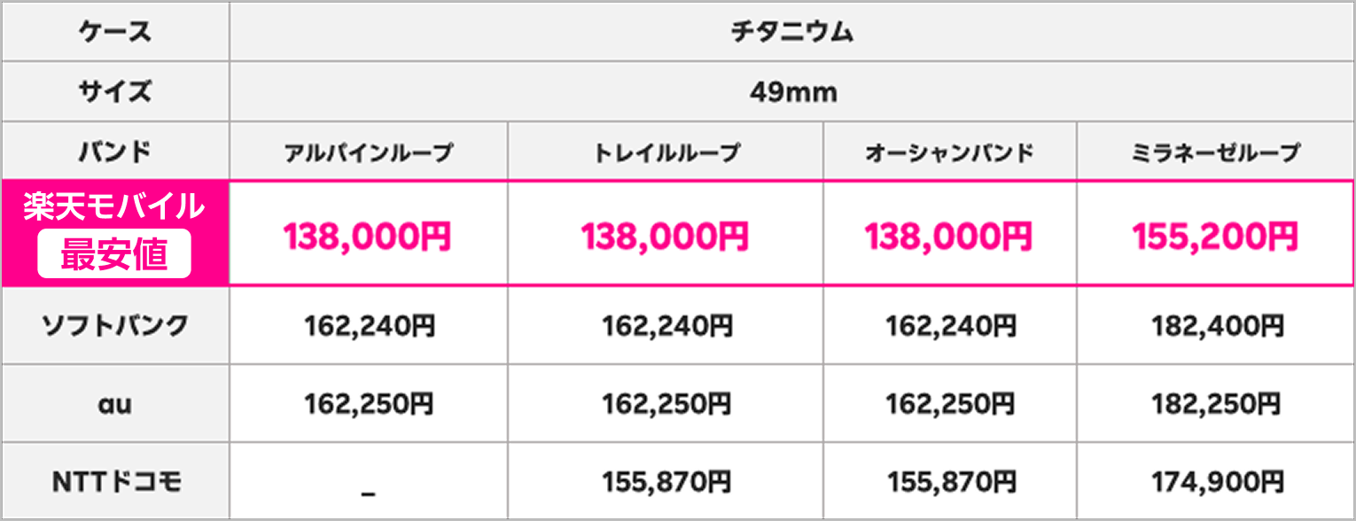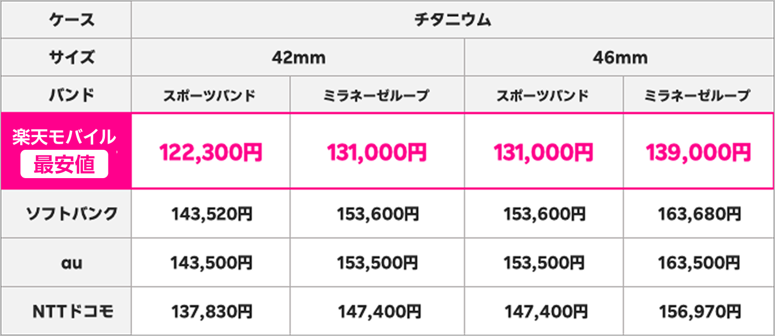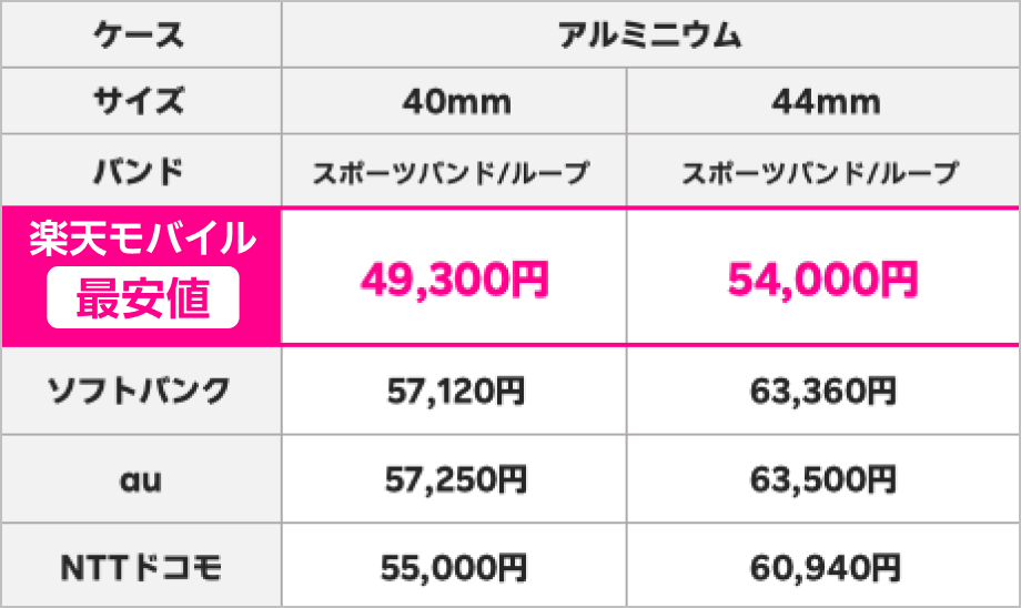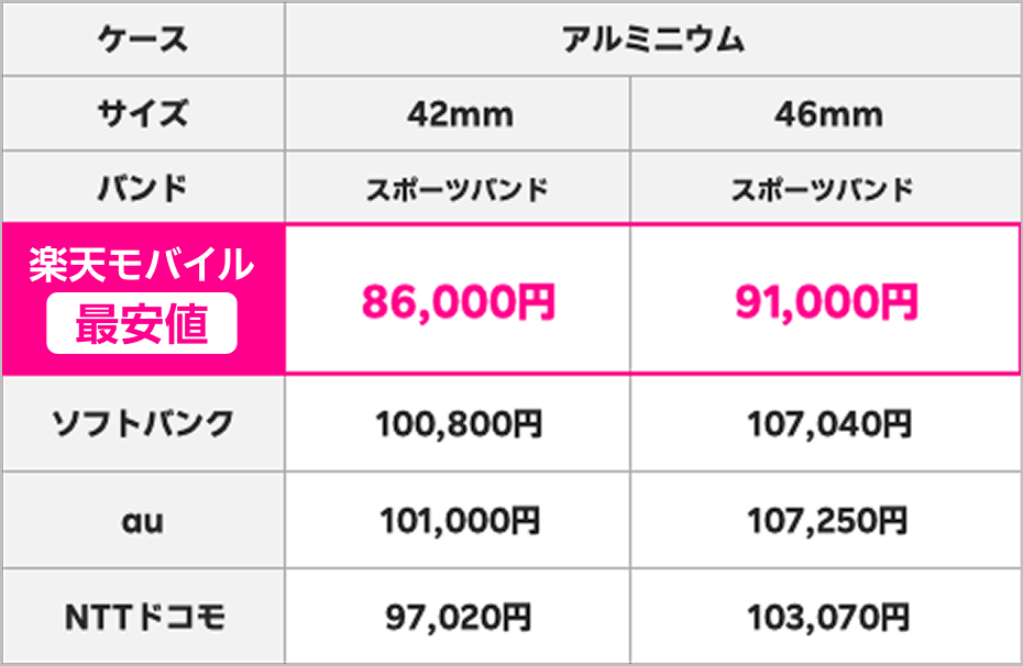 最新のApple Watchを購入するなら、楽天モバイルが1番おトクです。詳細は以下の価格比較表をご確認ください。