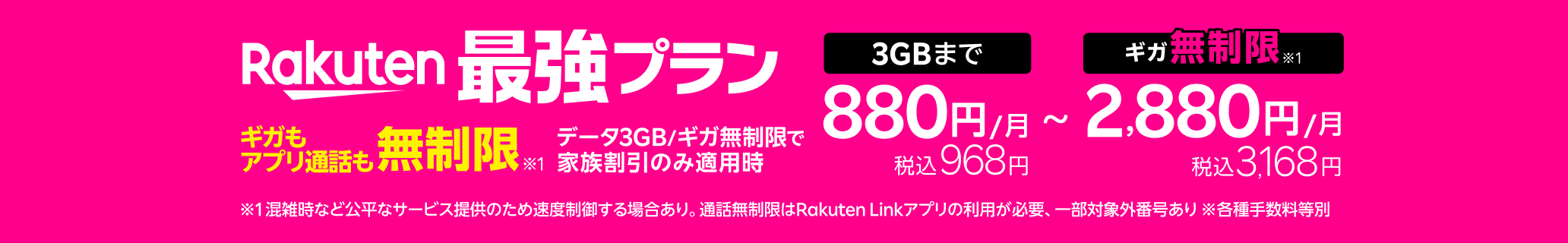 Rakuten最強プランは家族割引適用時、ギガもアプリ通話も無制限!
