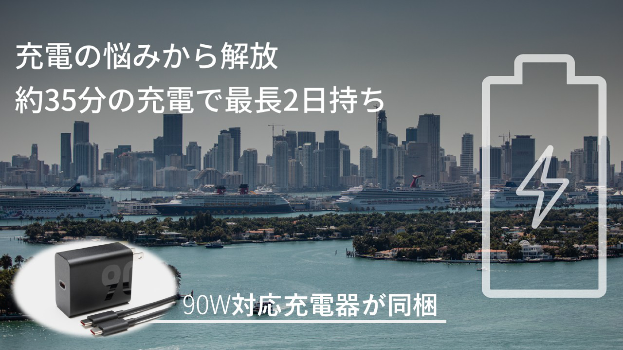 1回の充電で2日持ち※3。電池残量を気にせずアクティブに使えます。同梱の90W対応充電器を使えば、1%から100%まで約35分の超急速充電が可能です※4。また、独自の充電制御技術により、電池の劣化を抑え、5年後でも初期容量の80%を維持※5。購入したときの電池持ちが永く続きます。