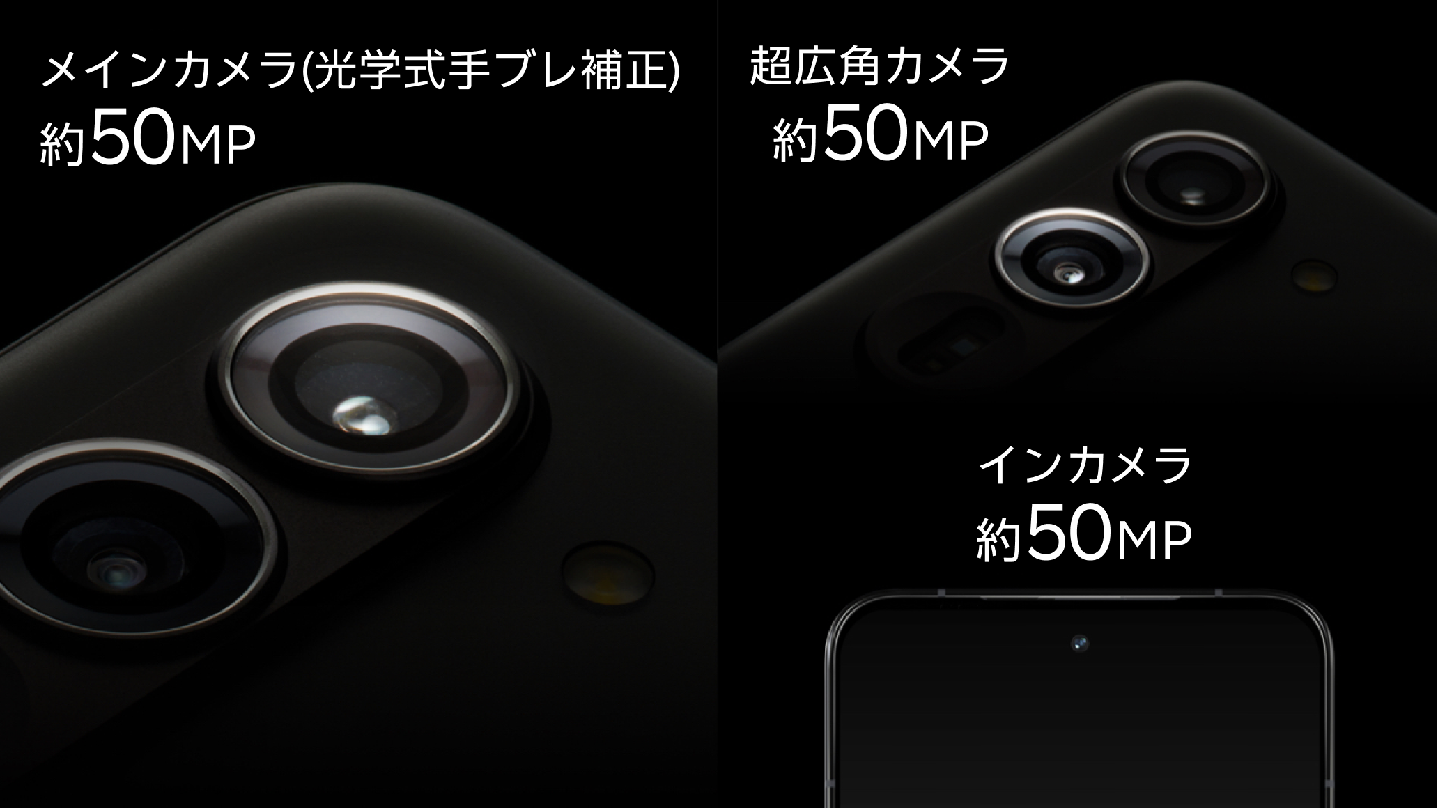 約5030万画素メインカメラでは、明るく美しく被写体を捉えた撮影を楽しめる、1/1.56センサーとなるソニーのLYTIA・LYT-700Cを採用。さらに、光学式手ブレ補正機能を搭載。超広角カメラとインカメラはともに約4990万画素カメラを搭載し、様々なシーンを高画質で美しく切り取れます。